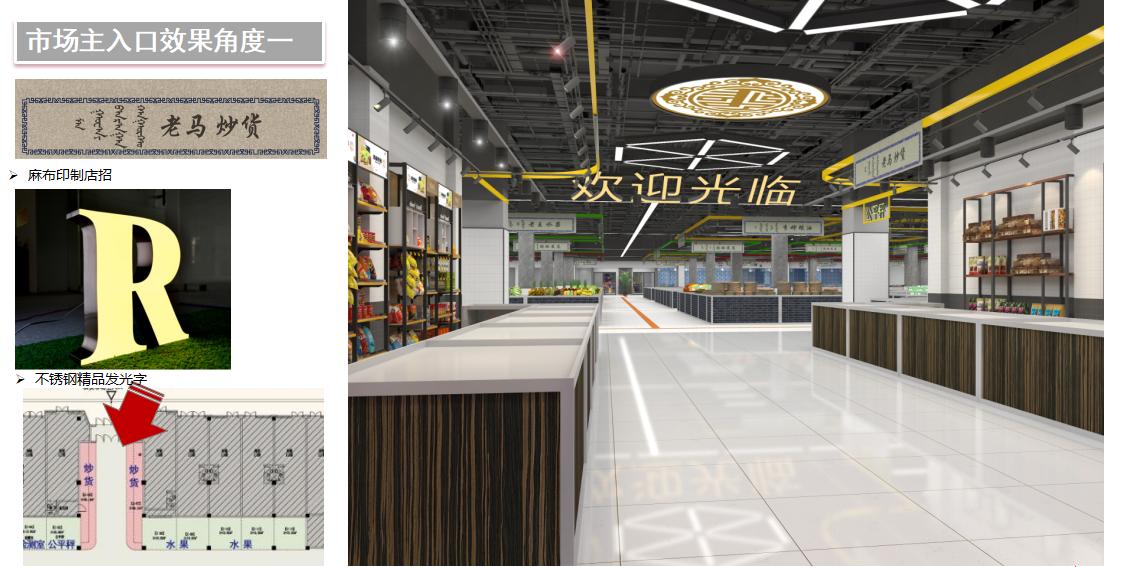 區別于傳統農貿市場或者菜市場的業態單一,時尚不足,購物不全的特點,讓購物在輕松、樂趣的氛圍下盡情體驗生活。區別于冷漠單一的消費交易,近20000平米的綜合市場,按品類功能劃分為:海鮮水產區,美食天地,健康加油站,花藝館,新鮮菜市,鞋類包類飾品區、家居生活用品區,美酒&茶葉區,新鮮食材現場烹飪等等業態。以求給顧客呈現出一個融合了時尚、簡約、品類齊全的全新的購物休閑環境。